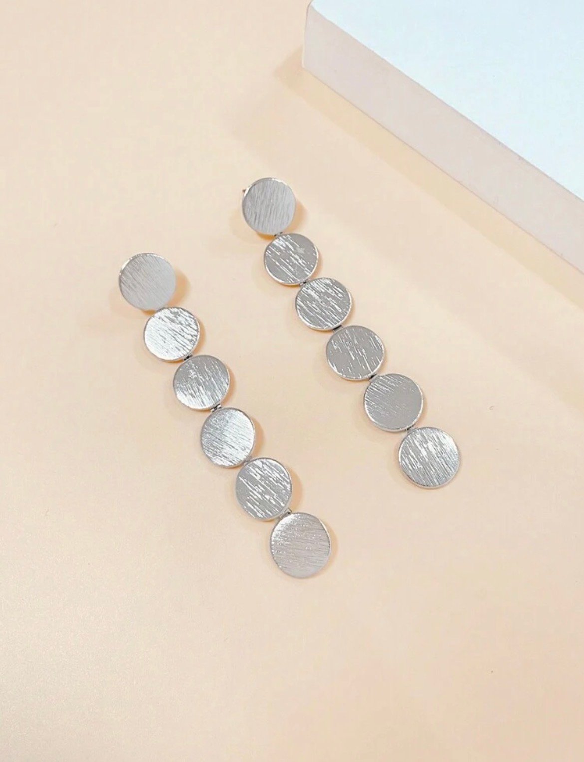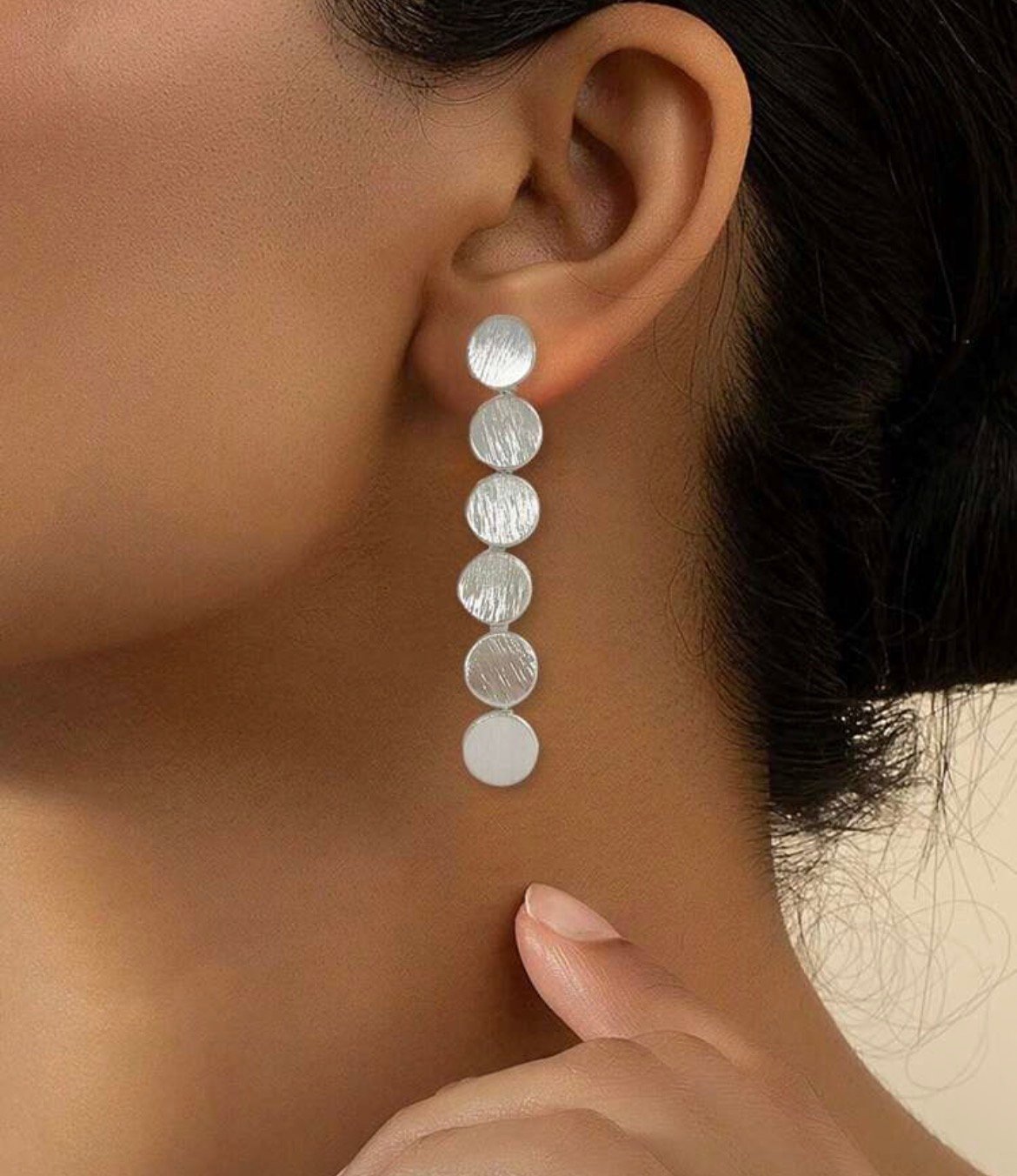 Pendientes de plata largos compuestos por círculos de textura irregular.