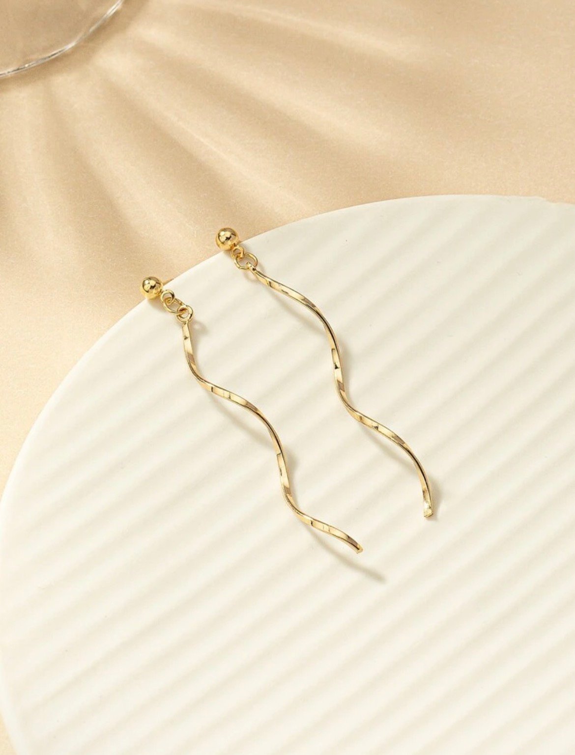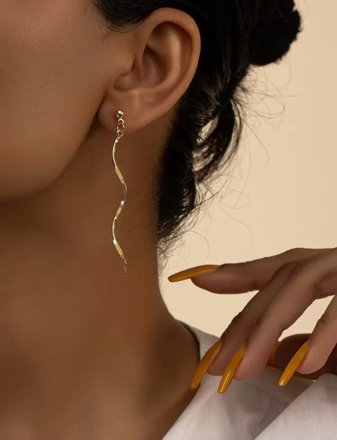 Pendientes de oro largos en espiral, perfectos para darle un toque elegante al outfit casual.