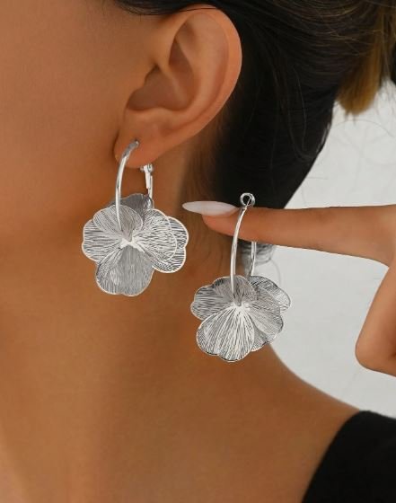 Pendientes en forma de aro de plata con una flor del mismo material. Perfectos para una ceremonia o evento elegante.